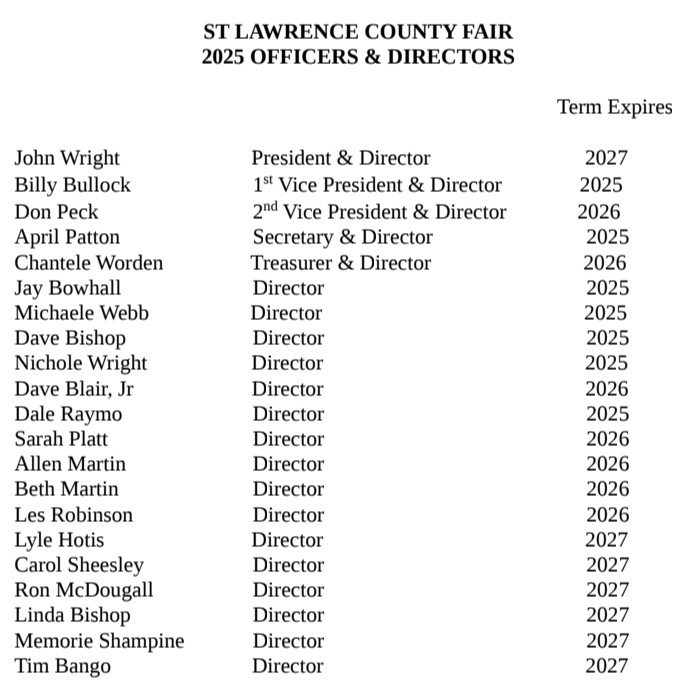 var body = document.body; body.className += " u-body u-xl-mode"; body.style.cssText += " "; var dataBg = ''; if (dataBg) { body.setAttribute('data-bg', dataBg); } Contact Us Fair Manager Don Peck315-771-7690315-287-3010 Gouverneur Agricultural & Mechanical Society Associate Directors Fred DeloshBob DrakeTamara HillNatalie SpilmanLisa PerrySara PlattDale RaymoChloe RenaudSam RosnergillesJordan MacDonaldMemorie ShampineMelissa TulipMichael WainwrightMichaele WebbKevin Wells 5